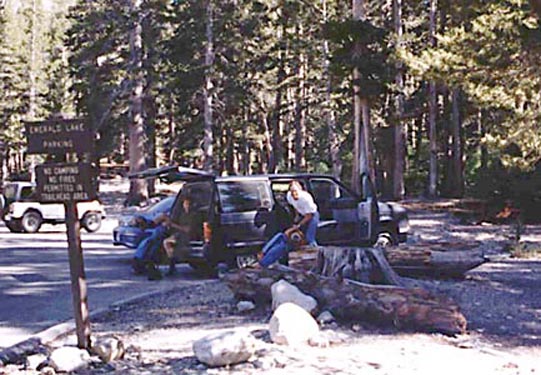 The group unloads their packs from the 'Bug Van' in preparation for the journey