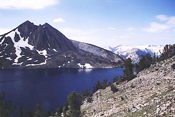 From our vantage point on the trail just below Duck Pass, we can't help but notice the stunning azure waters of Duck Lake, with shattered dome marking its far shore.