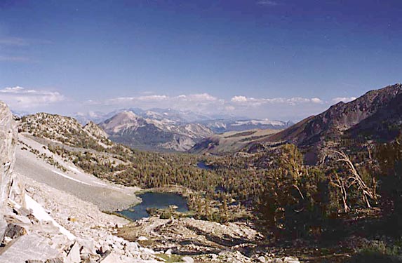 We're on our way back to civilization, though it isn't readily apparent here. This photo is taken just below Duck Pass on the Barney Lake side, which is the largest body of water visible.The rounded gray peak at center left is the popular ski destination of Mammoth Mountain.