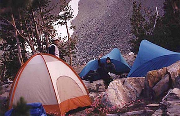 We have arrived at our destination for day 1. With camp set up and dinner eaten, it's time to relax. The time is 8:00pm and light is fading. Barry, despite the moderate climb has still not burned his daily allotment of calories and so is still walking around. Phil signals that he is a-okay, but Scott has a slight headache hinting at a tinge of altitude sickness- unfortunately not at all uncharacteristic for him.