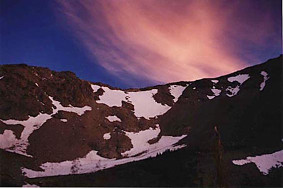 The group is treated to a colorful scene as the setting sun tints the wispy clouds behind the ridge surrounding Barney Lake a delicate salmon hue. With the slight scent of smoke still in the air from a nearby campfire used to fry up the trout catch of the day, the group retires for the night. It's a long 10 hour night- even longer for Scott whose altitude sickness worsens slightly.